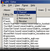 After clicking the Popup menus button, the mIRC Editor window will appear. Here you can edit all of the mIRC menus. In our case, we will add a menu item called "Voices" to the top of the menu that appears when the main channel text area is right-clicked. The example here creates a menu with items for sounds in the first downloadable sound pack above. To add the items to the menu, click on "View" and select "2 Channel." This will set you to add items to the channel menu. To add the actual menu items, copy this code and paste it into the top of the text edit area. We won't go into the format of the menu code itself, you can probably see by examining it that & indicates menu items, . and .. indicate menu levels, - indicates a line in the menu, etc. Click File, Save & Exit to save the menu and close the window.