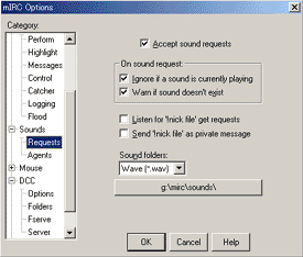 To be able to send and receive sounds to/from other users and the channel, the first thing to do is ensure that your client is listening for sound requests from others. To do this, hit Alt-O. This will bring up the mIRC Options dialog. Scroll down to Sounds and click on Requests. You should see something like the image on the left. At the top, make sure "Accept sound requests" is checked. Then look at "Sound folders." For each type of sound file listed in the drop-down box, choose the directory where these sound files will be stored. Then hit OK. When your client receives a request to play a sound, it will look in these directories for the appropriate sound file.