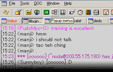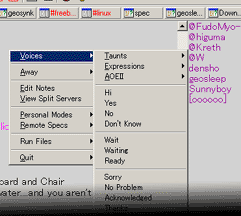 After performing the above steps, you should be able to bring up a menu by right-clicking in the channel window (in the main channel conversation area, not in the nickname list). You should then be able to select a sound and have it played to the channel when clicked. The example to the right shows what this should look like, with the Voices menu at the top, and a sub-menu coming off to the side with further sub-menu options, etc. You can edit and categorize these as you see fit. If you look closely at the example, you can see that an extra menu item called "AOEII" has been added under "Expressions." This was done to add in menus for the second downloadable sound pack above. Code for this is not included here, but you should be able to make your own without too much trouble by following the example code above. Going back into the Popup menus, you can click on View, select Query/Chat, and paste the same code in there to make an identical menu to use when privately talking with someone outside of the main #bujinkan channel.