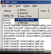 You can also create another menu to use when a nickname is right-clicked in the nickname list beside the main chat area. This can be used to send a sound to only the person whose nickname was right-clicked. To do this, you would follow the example above, except that you would choose "4 Nickname list" from the View menu and put the code in this area. Another difference with this menu is the necessity of the variable $1, which denotes the nickname which was selected. You can see from the example to the left that the $1 is placed between the /sound command and the filename.wav in each line of the menu code. After setting this code, you would again Save & Exit, and should then be able to use the new menu.